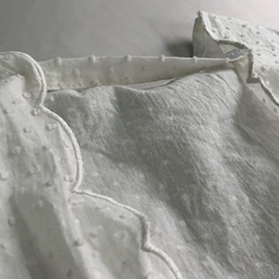 袖口と裾にあしらわれた繊細なスカラップが、着こなしに優雅なアクセントを添えます。
