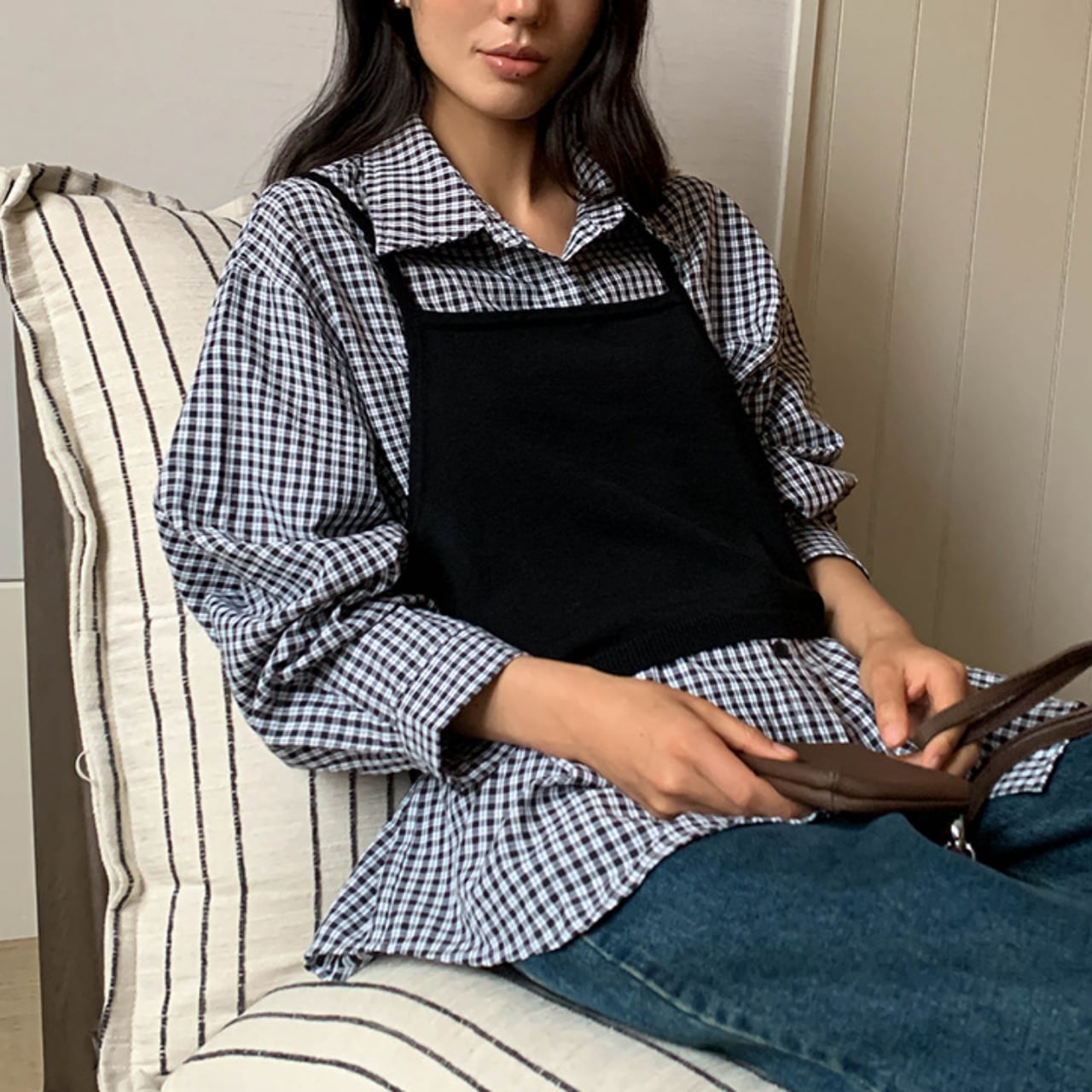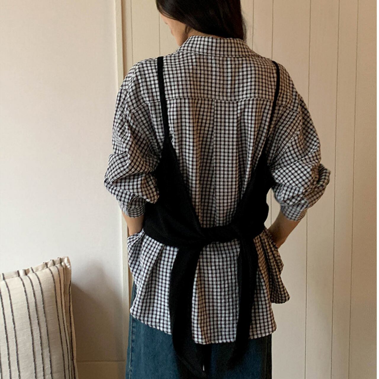 知的なチェック柄のシャツと、シックなビスチェが織りなす、洗練されたレイヤードスタイルを叶えます。