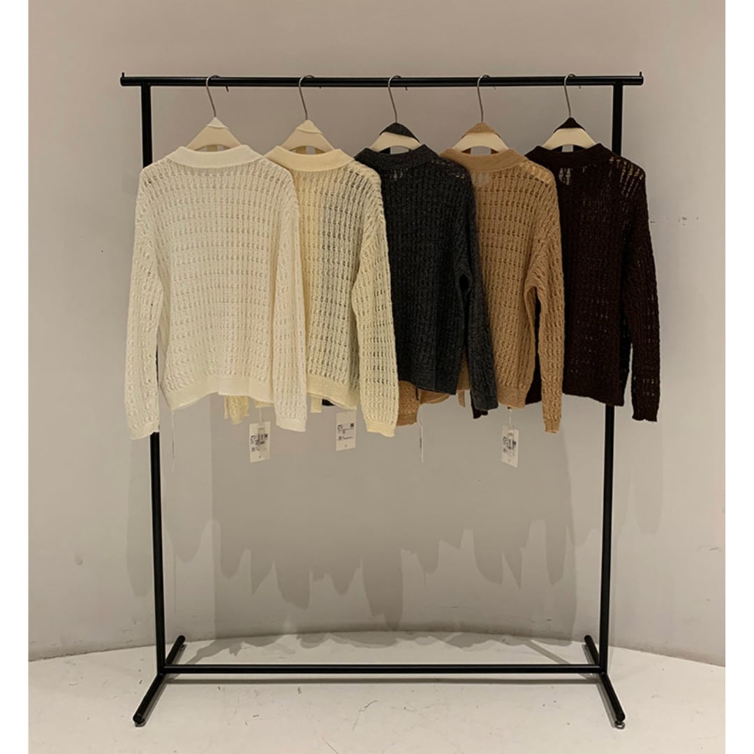 洗練された透かし編みがお洒落な、タイ付きポロカーディガン。