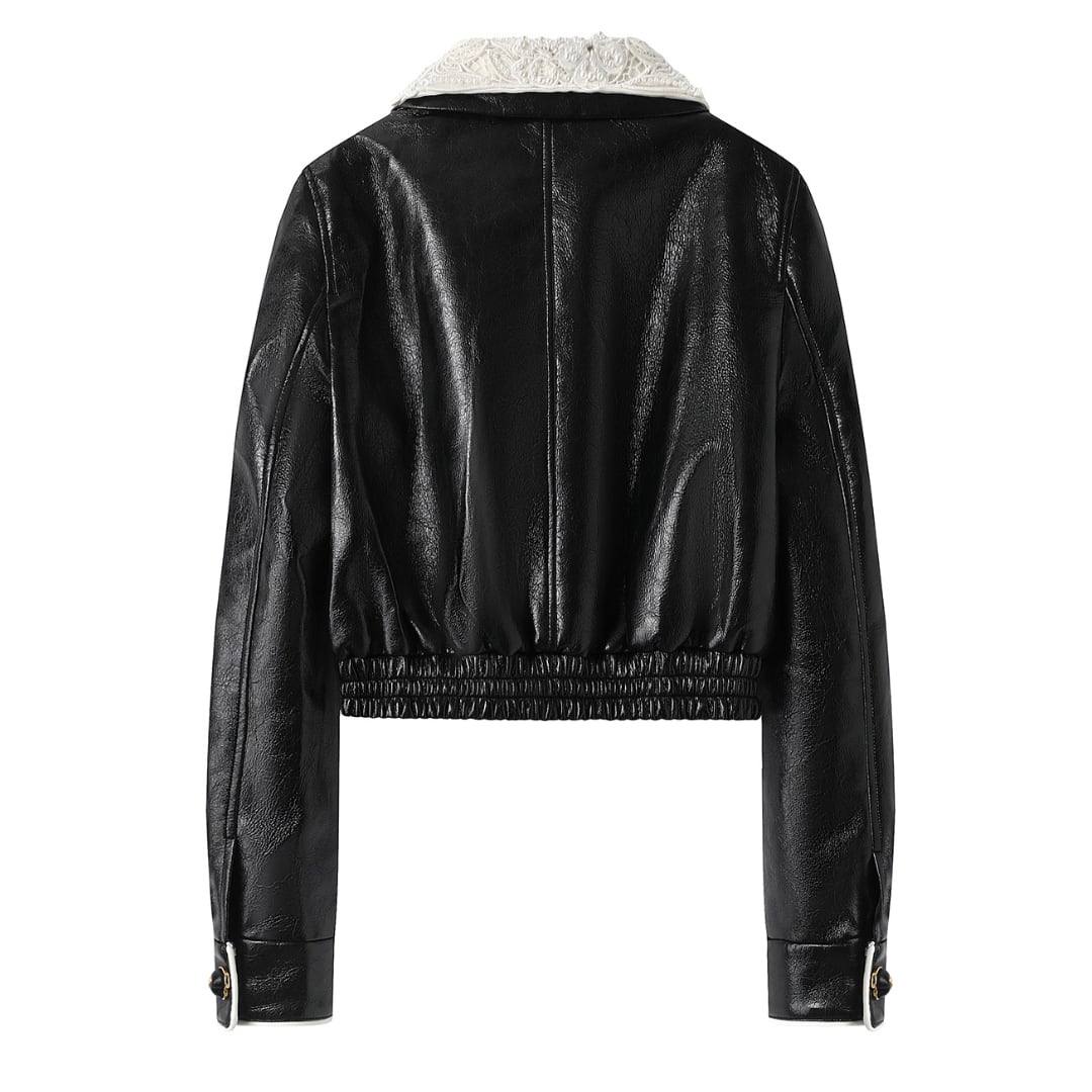 上品なレース襟と、ハート型ボタンが目を惹くレザージャケット。