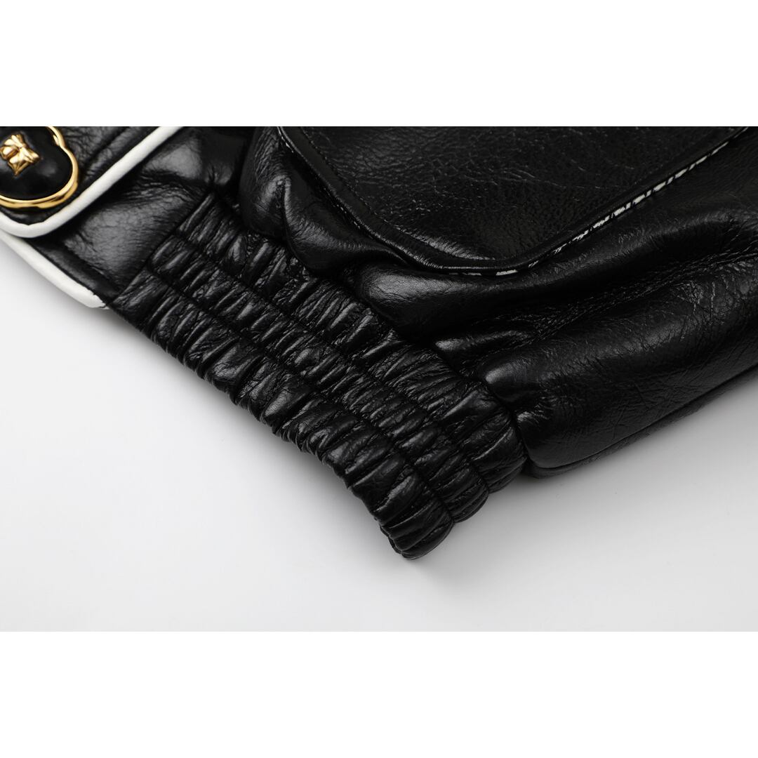 艶やかなフェイクレザー素材と、白のパイピングがモードなフレンチシックを演出します。